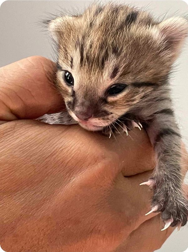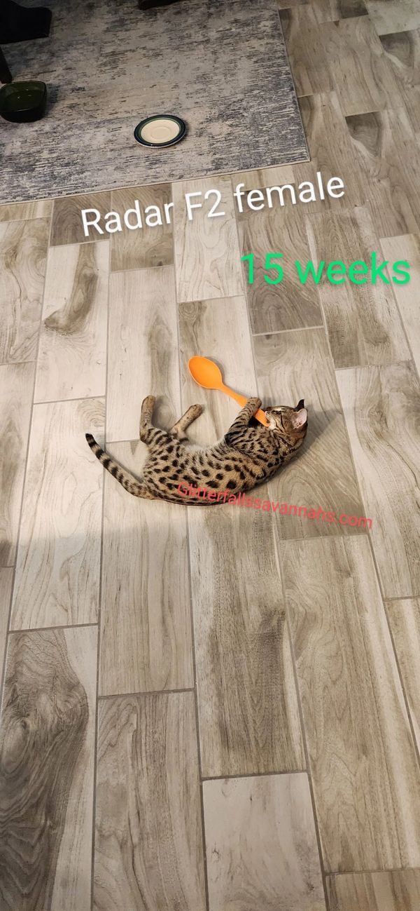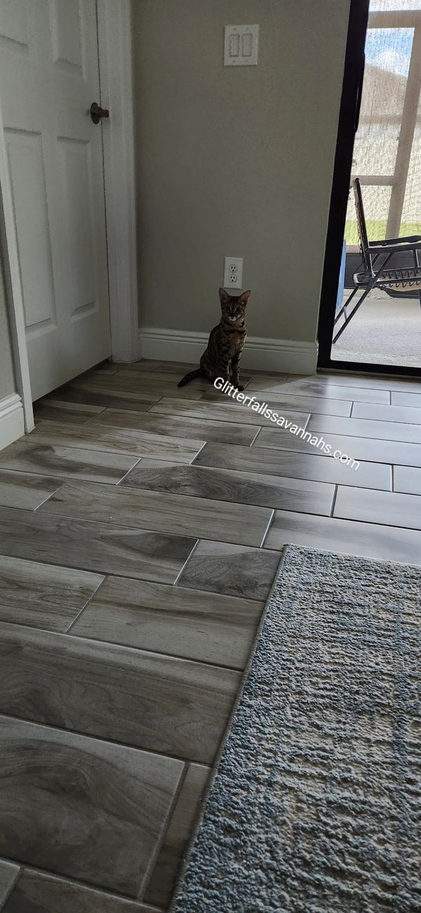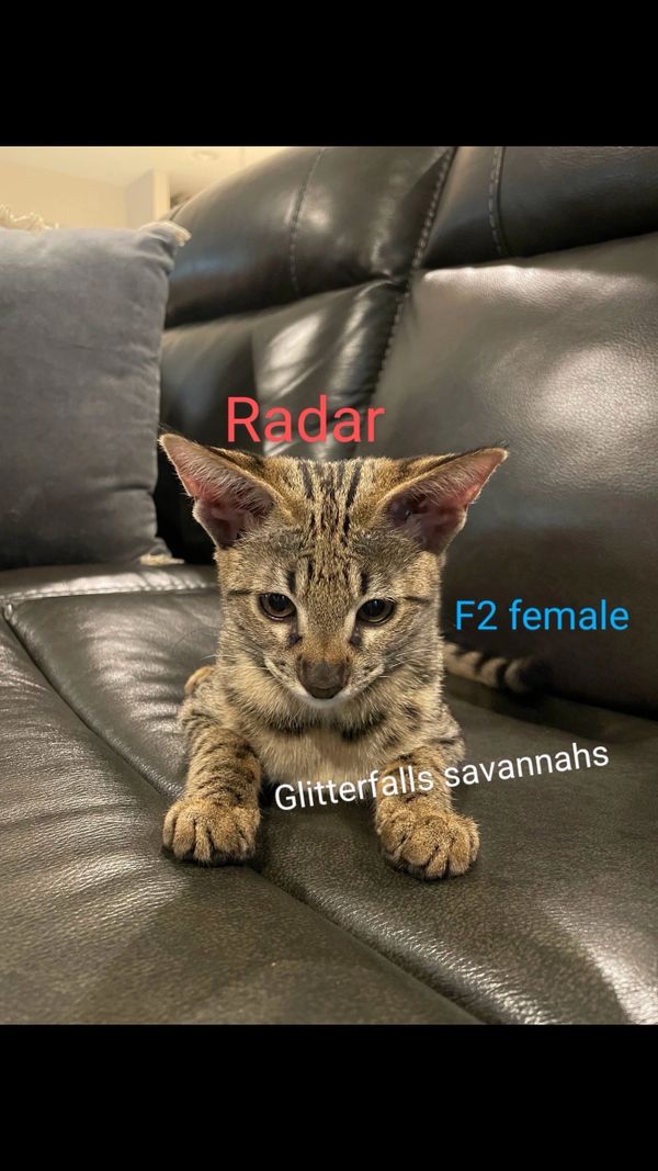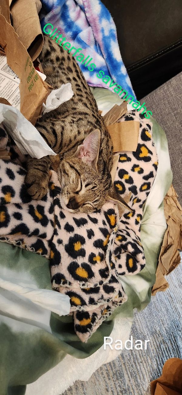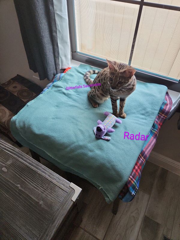 Our cattery is family owned. Mark has been in the pet trade since he entered the work force. After college he was in a sales job (pet related of course) He loves all pets. We have had all sorts of animals. Hamsters, ferrets, chameleon, snakes, fish and of course cats. He started researching Savannah cats because he was very interested in the breed. He spent years talking about them and showing me pictures of them. During covid, we had a chance to move from one home to another. Mark did research and we talked to Drinkwater Savannahs about adopting a cat. Shortly after we moved in, we adopted Sparkles (F1 female dam) from Drinkwater. She has her own bedroom. About six months later, we went back to Drinkwater Savannahs and got Stewie, our sire. He also has his own bedroom. We waited for both cats to grow. And grow they did. When Sparkles was two, she got pregnant and had a miscarriage. We were very upset. Several months later, her and Stewie hooked back up and we had our first litter November 21, 2024. It was only one kitten, a female F2 that we have named Radar. She was a breached birth but that was the only trouble she has been. She is a great kitten. We have talked to several breeders online for advice. We have a teenager that helps us care for the cats. They have 24/7 inside care. The cats are allowed in a lanai to play. My name is Carla, I am the cat mom.